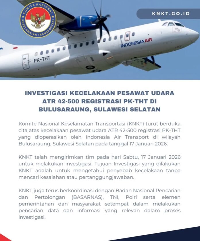 KAREBAKALTIM.com, Jakarta — Komite Nasional Keselamatan Transportasi (KNKT) memastikan pesawat TR 42-500 yang mengalami kecelakaan di kawasan Gunung Bulusaraung, Sulawesi Selatan dilengkapi sistem deteksi dan peringatan medan berbahaya, seperti pegunungan. Pernyataan ini disampaikan dalam rapat kerja bersama Komisi V DPR RI di Jakarta, Selasa (20/1)