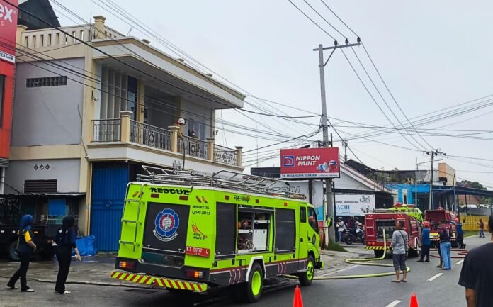 KAREBAKALTIM.com, Bontang – Kepulan asap hitam tiba-tiba membumbung dari lantai dua Ruko Megah Jaya Keramik di Jalan Pattimura, Senin (24/11/2025) pukul 09.50 pagi. Kejadian itu sontak membuat warga di sekitar lokasi panik dan berhamburan keluar rumah. Situasi sempat menegangkan sebelum petugas pemadam tiba di lokasi.
