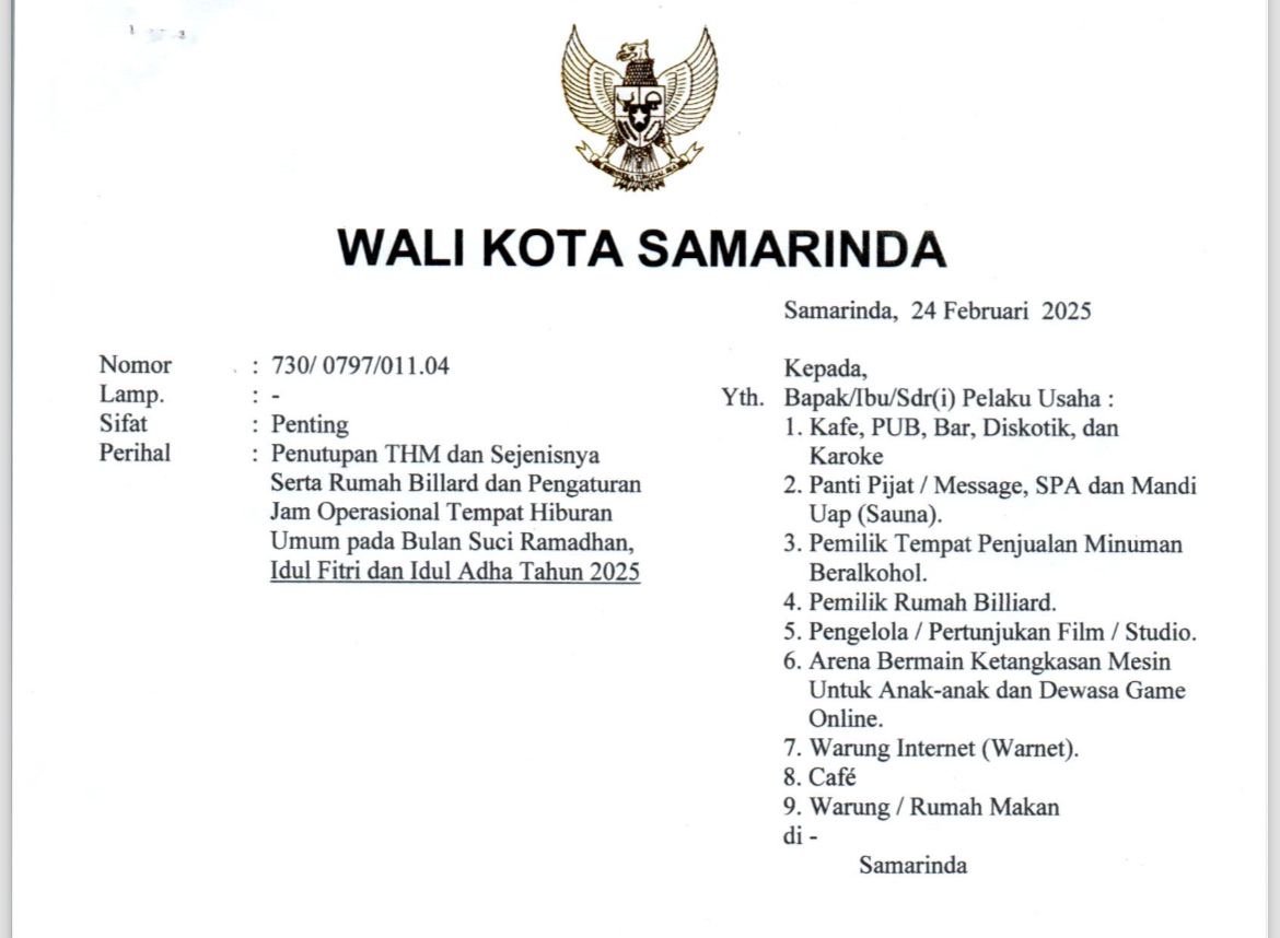 Surat edaran ini mulai berlaku sejak diterbitkan pada 24 Februari 2025 dan diharapkan dapat menjadi pedoman bagi seluruh pelaku usaha di Kota Samarinda. (Bey)